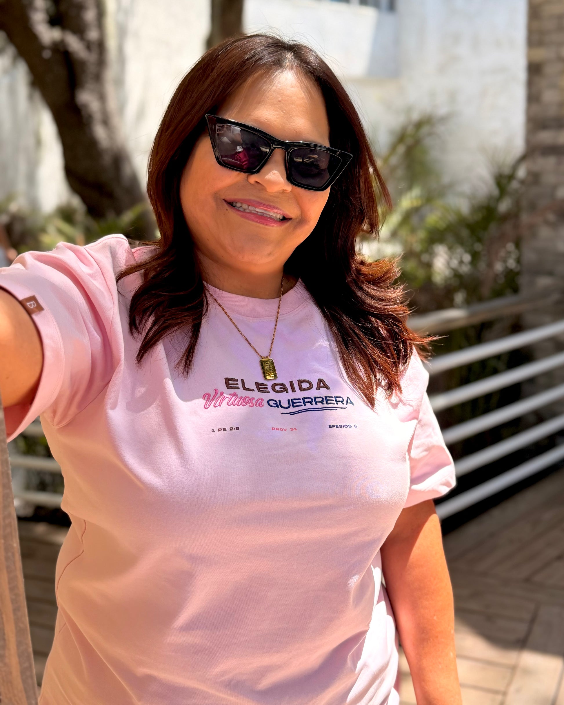 Confeccionada en un tono rosa delicado y con bordado de alta calidad, esta pieza une propósito, fe y fuerza en un solo diseño.