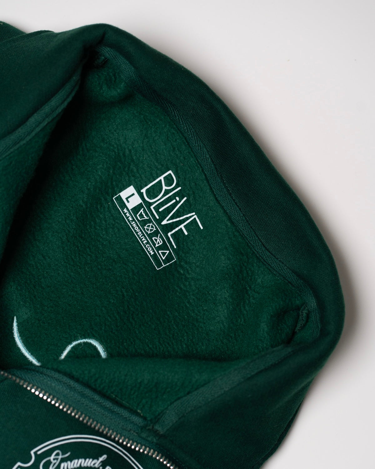 La icónica B de Blive en el frente y el bordado “Emanuel” en la espalda, ambos en un tono azul claro, representan presencia, paz y propósito.