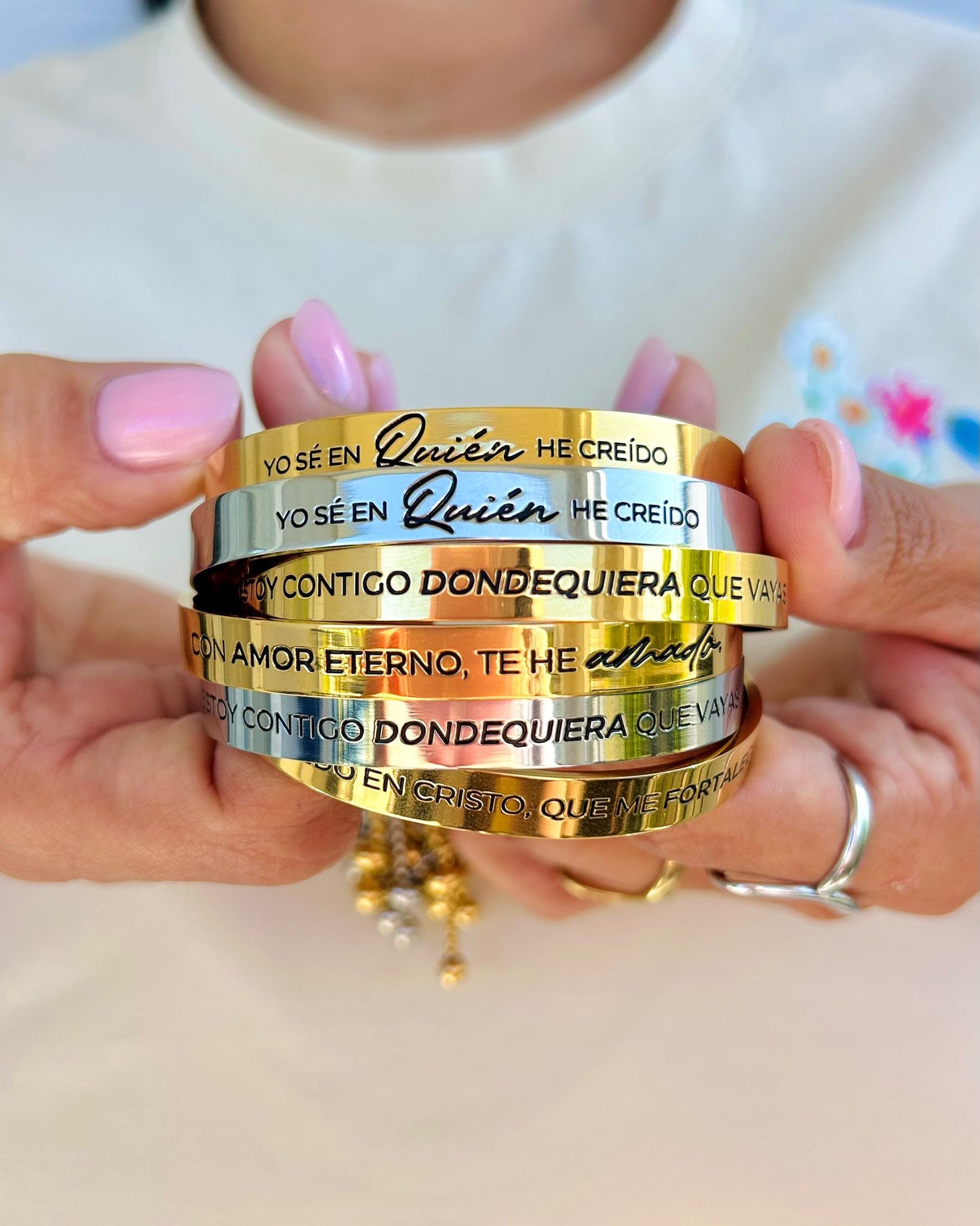 Estas pulseras están diseñadas para llevar contigo las promesas de Dios en cada momento de tu vida. Cada pieza está inspirada en una palabra de esperanza, amor y fortaleza, recordándote que no importa el desafío, Su fidelidad te acompaña.